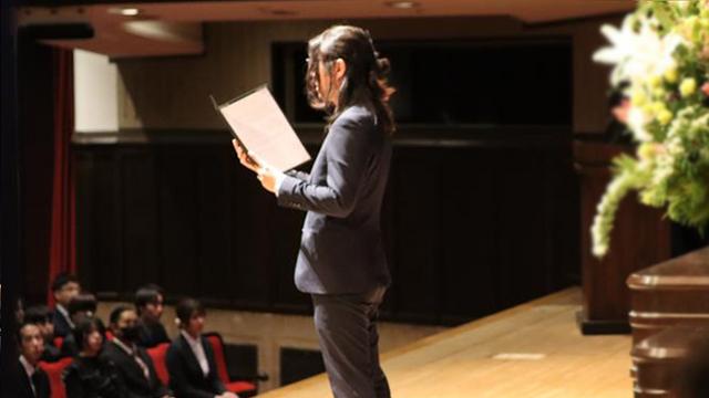 式では校長や来賓の日本マイクロソフトからの挨拶と、在校生からのメッセージが新入生に向けて贈られ、それに応えるように新入生代表の学生から入学の詞が述べられました。