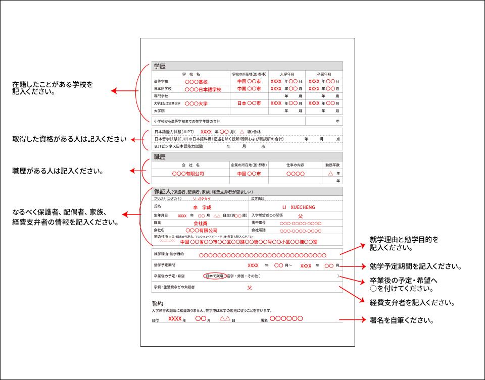 留学生入試(後期)入学願書「表」記入例